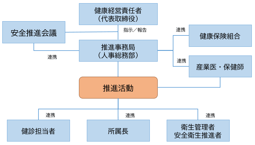 経営トップである代表取締役を最高責任者、人事総務部を推進事務局とし、全社的な健康経営の取り組みを推進していきます。